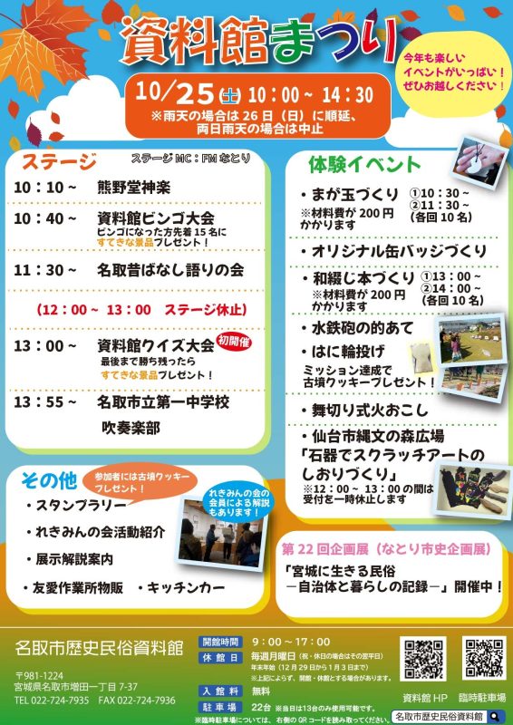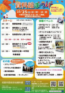 資料館で開催する年に一度のおまつりです。様々な体験イベントに参加できたり、民俗芸能や昔ばなし、吹奏楽の演奏などのステージイベントもあります!
